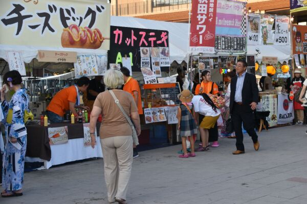 竿灯祭周辺の屋台で、秋田牛のカットステーキを食べ、生ビールを飲んだ
