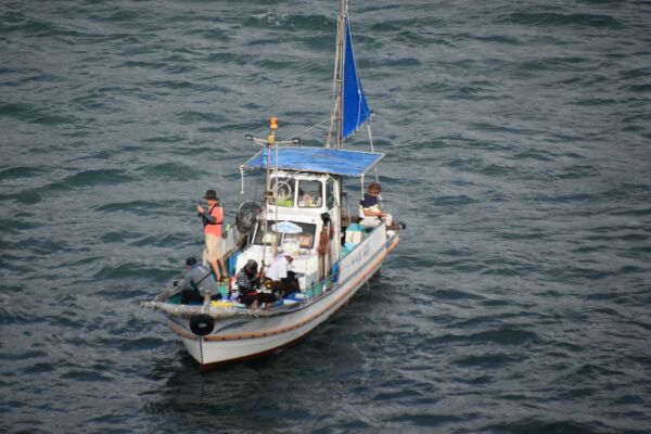 8月11日(日)の朝なので、関門海峡には釣り船が糸を垂れていた