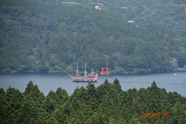 道の駅箱根峠から見た芦ノ湖と神社と遊覧船。この遊覧船にも乗船した 帰途小田原の前田商店で干物を買って帰宅した。大変美味しかった