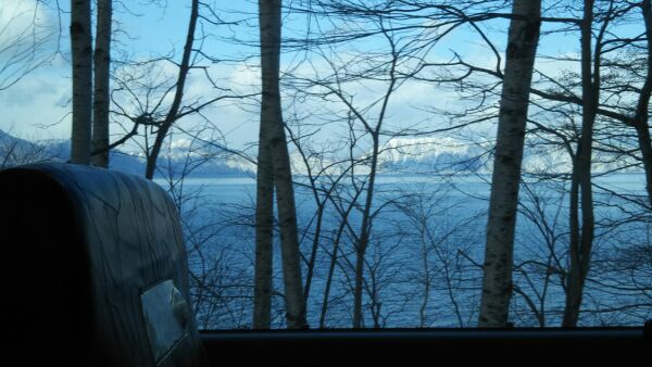 帰りのバスの中から撮った恵庭岳と支笏湖。恵庭岳は見えたが木が邪魔をして写っていない