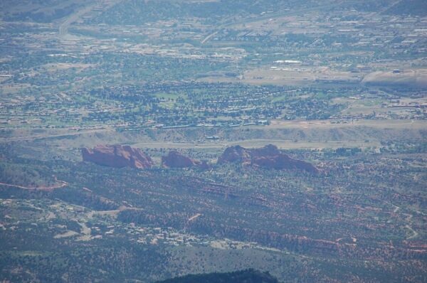 パイクス山頂上から見たガーデンオブザゴッズ、ヴィジタセンタも見える。その向こう に見える街はマニトウスプリングスか否かは定かではない