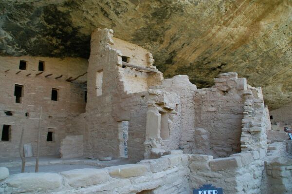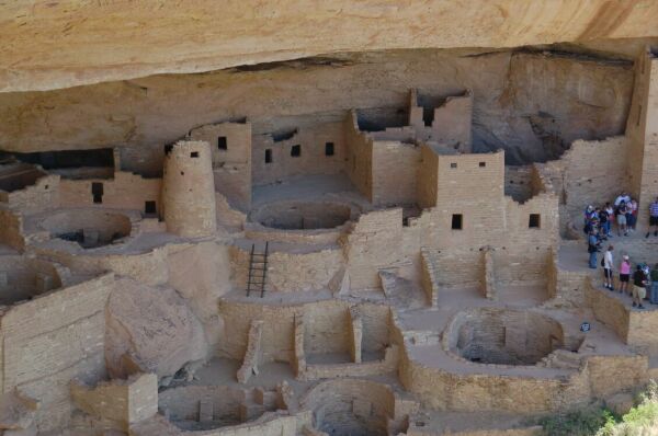 翌日、メサヴェルデ国立公園へ来た。この写真は1400年前の先住民族(アナサジ族)の 住居跡のうちのスプルーズツリーハウスである。ここ標高2600mのところで農耕プラス 狩猟生活をしていた。700年後人口が増えたこと、天候不順のとき食料不足をカバーしきれ なくなったことにより、この地から姿を消したという。この民族の末裔がナホバ族に いるという。ここはアメリカで最初に世界遺産に指定された