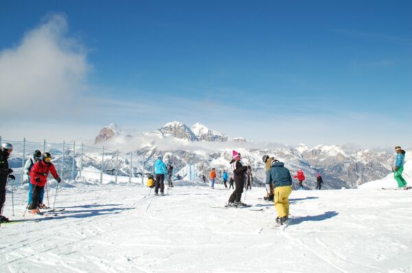 ファローリアエリアで最も高いところからトレチーメをバックに滑る人、トレチーメを 眺める人