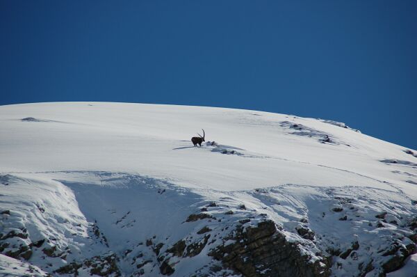 2月26日チュウルス(Zurs)のTrittkopfのロープウエイを繰り返し滑っていると、 多くのスキーヤーが立ち止って何かを注視しているところにきた。鹿が雪の中をゆっくり 歩いていた