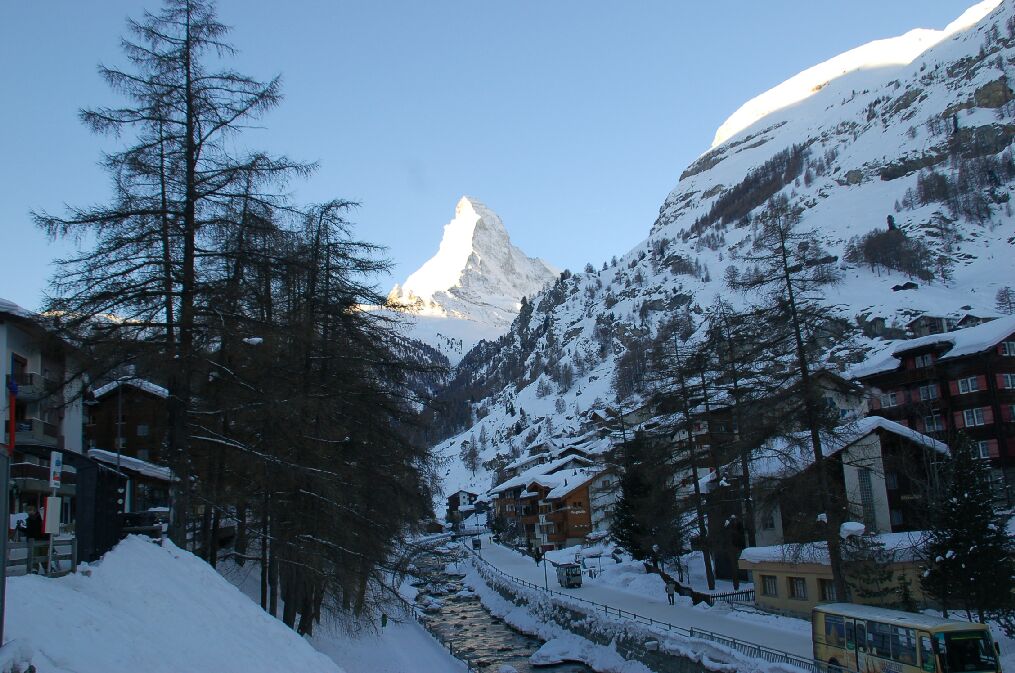 Zermattから見たMatterhorn。右手にあるバスが通過したところに見える黄色の建物は、今回宿泊したホテルアンチカ(Hotel Antika) の別館である