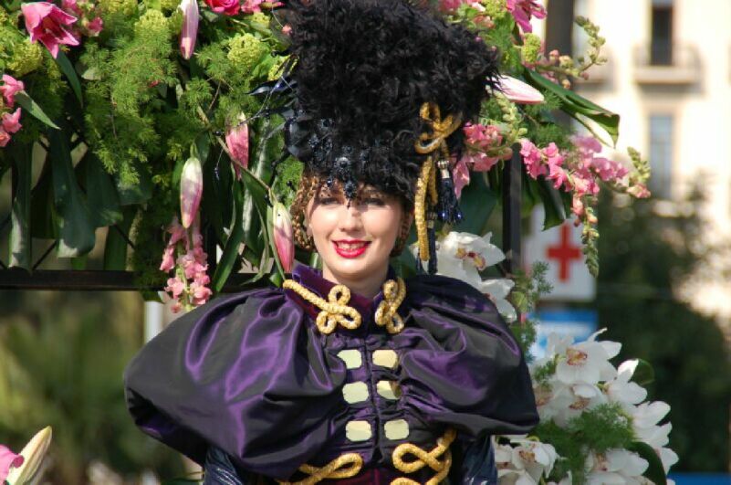 ニースのカーニバル、このような山車からのこような女の人が客席に沢山の花を投げ入れた