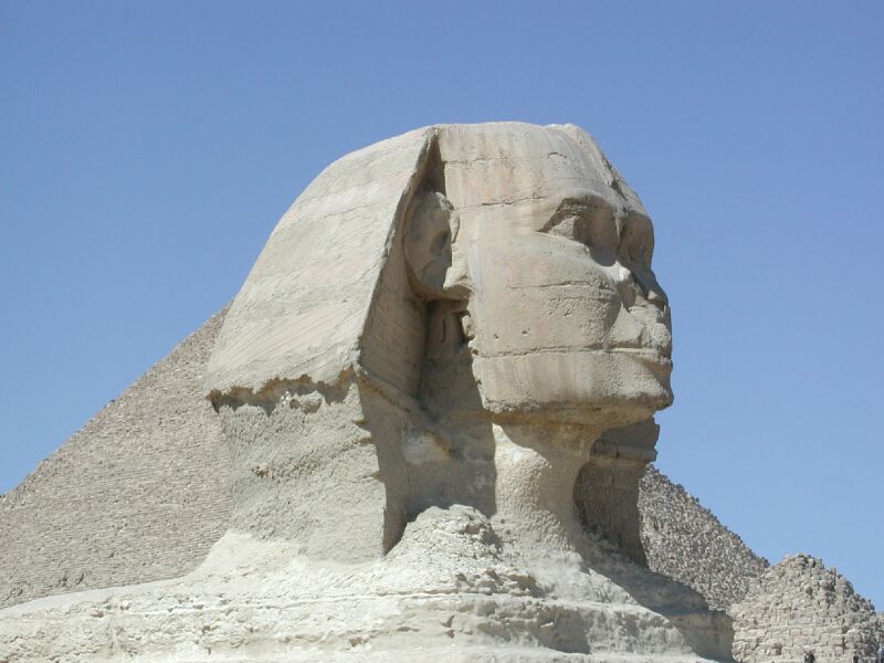 ギザのスフインクス、後方にクフ王のピラミッドが見える