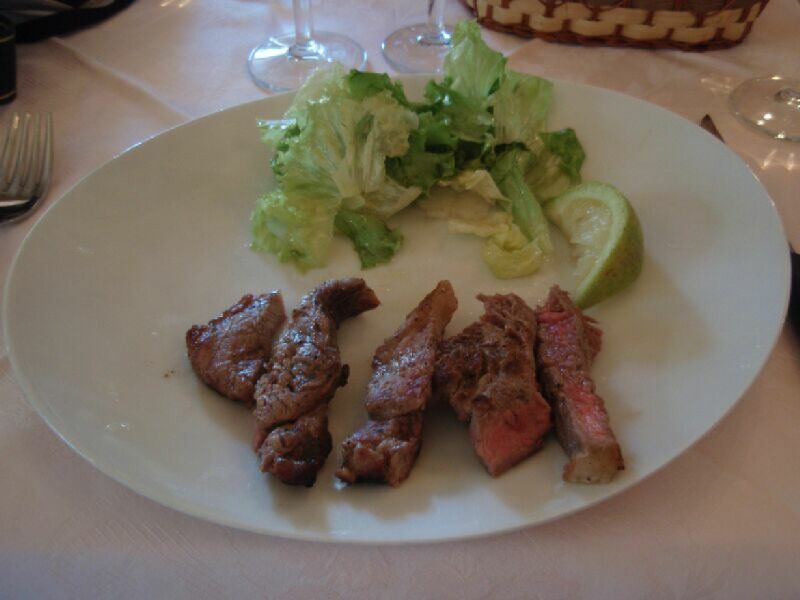 フィエゾーレ市から、フィレンツエを通り越して、ダヴィンチ村のアグリツーリズモで昼食、 この写真はセコンダーレのビステッカ、自家製 オリーブオイルをつけたパン、フンギポルチーニ入りリゾット、平べったい手打ちパスタ、 赤白ワイン、デザートワイン、デザート、どれも期待以上の味で美味しかった