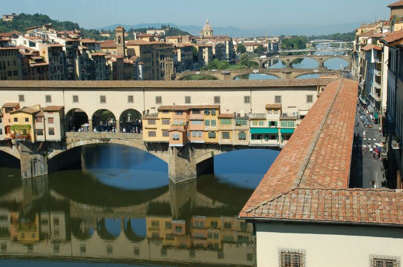 ウフィツイ美術館へ。ここは撮影禁止なので鑑賞した絵画の題名を列記してみる。 ジョットの王座の聖母子像、ウッチェロのサンマリーノの戦い、マサッチョの 聖母子、リッピの東方三博士の礼拝、ボッテチェリのヴィーナス誕生、 ダヴィンチの受胎告知、ミケランジェロの聖家族、ラファエロのローマ法王 ユリウス2世、テイチアーノのウルヴィーノのヴィーナスなどの名画を観た。 ヴァザーリの回廊に飾られた絵を観ながら、ピッテイ宮殿へ。