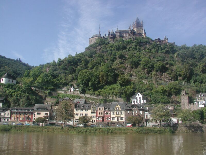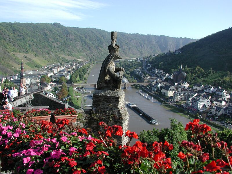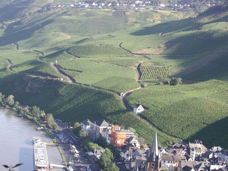 ランツフリート城から見たベルンカステルクースのぶどう畑と左下に停泊中のセレナーデ号