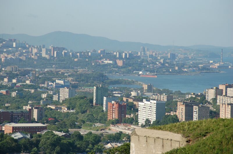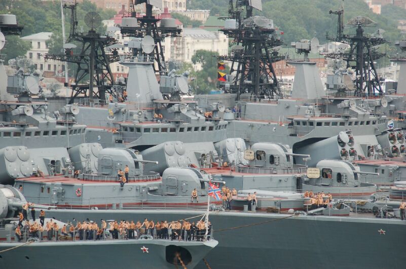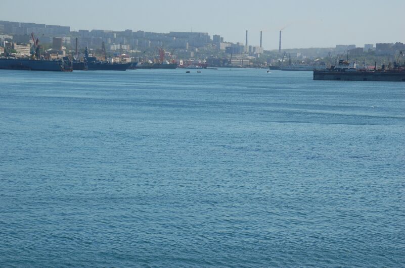 船からウラジオストークを見ると、多くの軍艦が停泊している