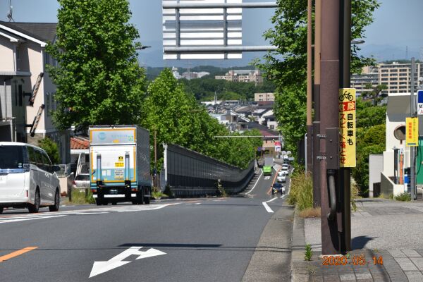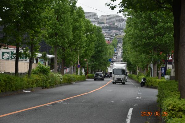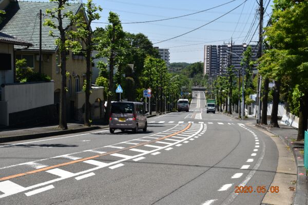 昭和音楽大学の前のバス通りで、新百合ヶ丘駅方向を見た風景