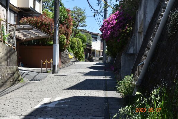 小田急線のガードをくぐり、今まで来た道をさらに西の方へ2-3分で世田谷通りに でる。四つ角に麻生警察署がある。世田谷通りを横切り5分程行くと金程交差点が ある。この写真は金程交差点を右折したところの坂道