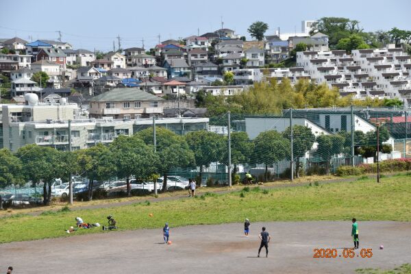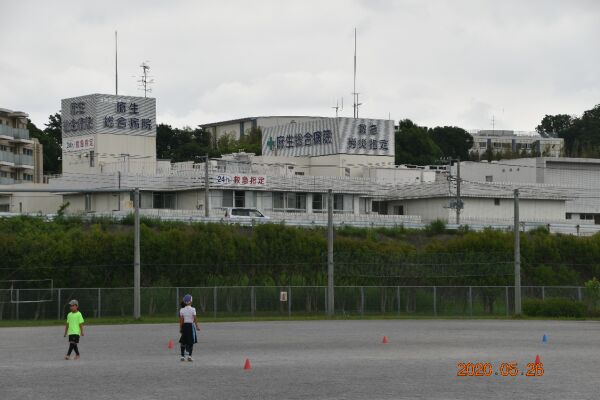 ふれあいの丘公園にある運動場麻生総合病院。コロナ禍のために休校なので小学生がサッカーをしている