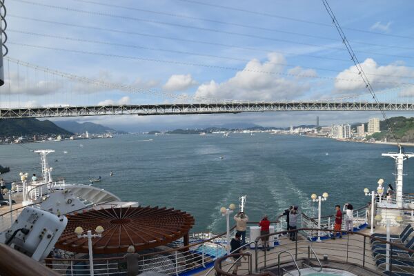 全長1068mの関門橋。他の船客もカメラを構えている。ダイヤモンドプリンセス