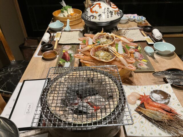 生、なべ、炭火焼きを食べた。なまの蟹肉は柔らかく、美味しさは物足りなかった
