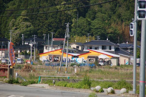 二日目に石巻を通り抜けて男鹿半島へドライブした。まだ復興していないと 感じた。写真中央にある2棟の黄色の建物は、おしかのれん街である。ここに売店と食堂 があり、ここで海鮮丼を食べた