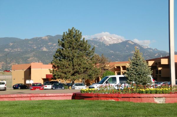 翌朝、宿泊したコロラドスプリングスのホテルから見たパイクス山は雲がかかっていた