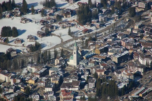 ファローリアのロープウエイを降りたところから見たコルチナの街。中央に教会が見え、 右下隅にバスセンタがある。鉄道は来ていない