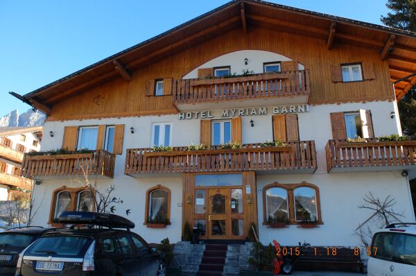 成田からチューリッヒに飛び、列車に乗り換えてインスブルックで1泊した。翌朝インスブルックから フォルテッツアに行き、そこでイタリア鉄道に乗り換えてドビアッコへ行き、そこからはバスで コルチナダンペッツオへ行く予定であったしかしが、イタリア鉄道がストライキをしていて 列車が動かないので、フォルテッツアからバスを3回乗り継いでドビアッコに行き、予定より 3時間遅れで5時頃コルチナダンペッツオのホテルミリアムに到着した。