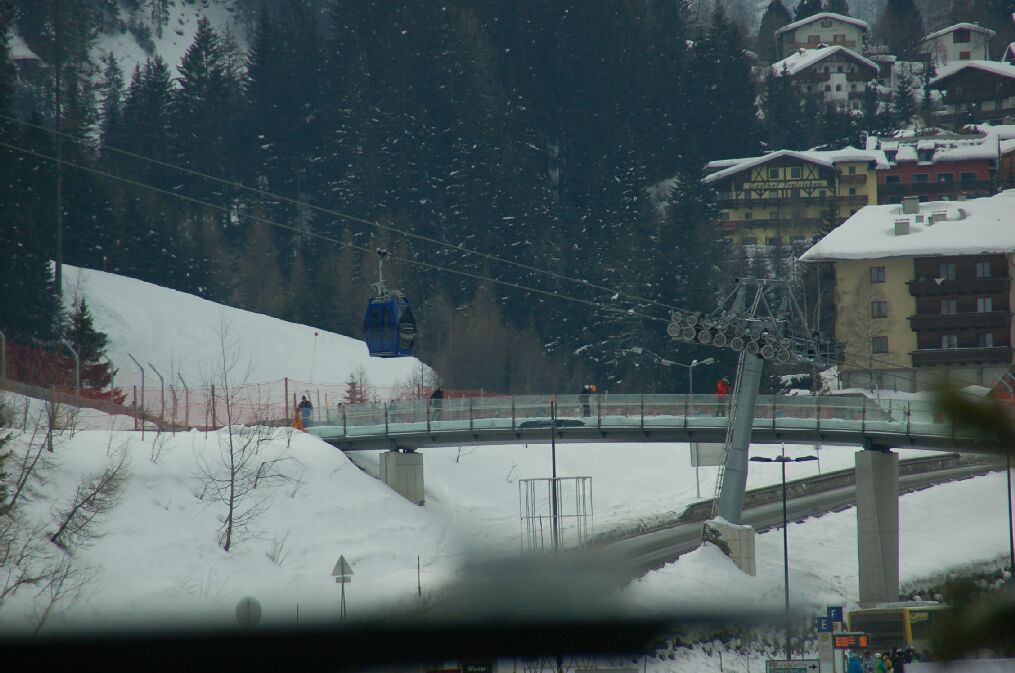 レンドル(Rendl)行きの青いゴンドラと、終点である鉄道を越える橋の上を滑るスキーヤーが見える。 リッフェル2(riffel2)の頂上は晴れているのに、下のサンアントンは曇っている