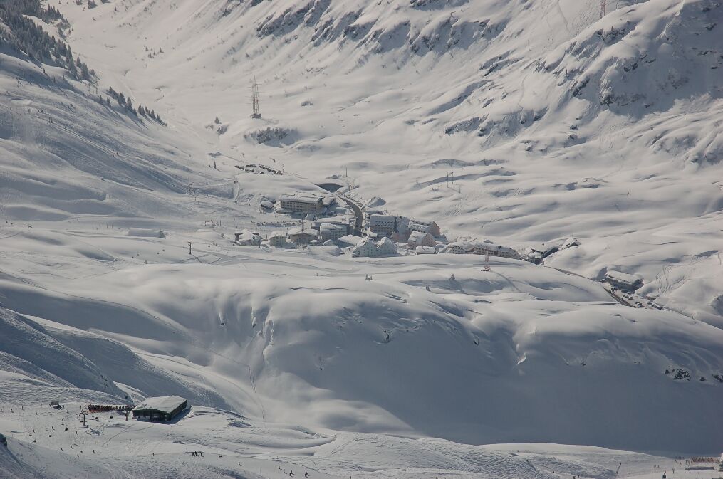ヴァルーガ(Valluga)展望台から見たサンクリストフ(St.Christoph)の町と、左下はシンドラ(Schindler) コースのリフト乗り場