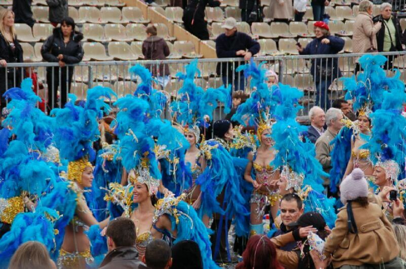 ニースのカーニバル、このような山車からのこような女の人が客席に沢山の花を投げ入れた